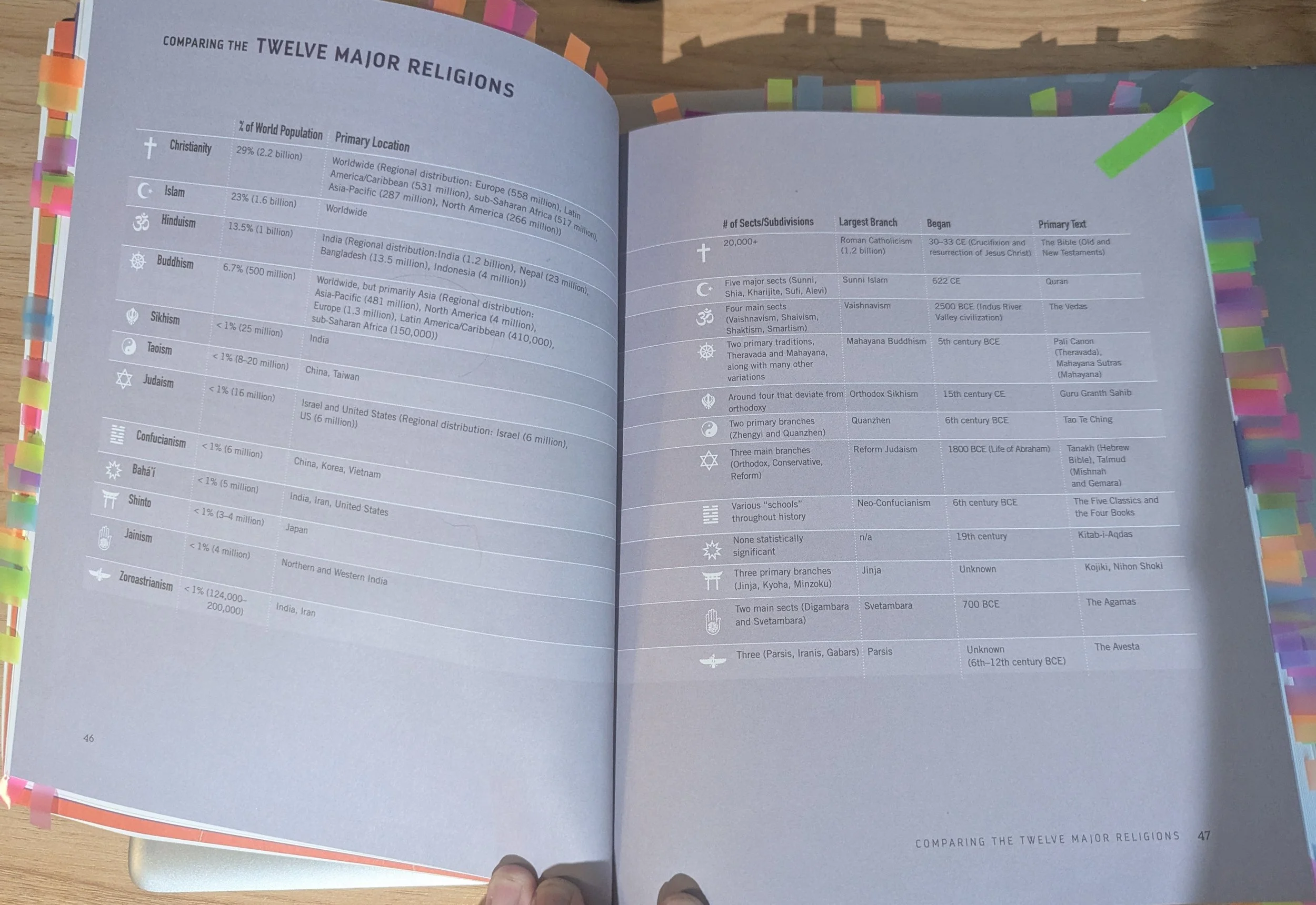 Each chapter started with a brief...and I mean, one page brief….overview of the religion under discussion, followed with a, again very brief, timeline of key events within that religion. Each chapter has a quick facts, which tells you the percentage of the worlds population that practices that religion, both in percentage and numbers, so for example, 29% of the world practices Christianity, which Is 2.2 billion people. A regional distribution is provided, how many in Europe, America, Latin America, Africa. Largest branch, which is Catholicism, when it began, and what is the primary text. A little bit of the culture that birthed the religion is discussed, before going into the major figures of the religion, which will include the founding prophet, in the cases of Christianity, Judaism, Islam, Bahai’, Buddhism, Confucianism...basically who started it. The only one without a grand founder is Shinto, which was basically always there.